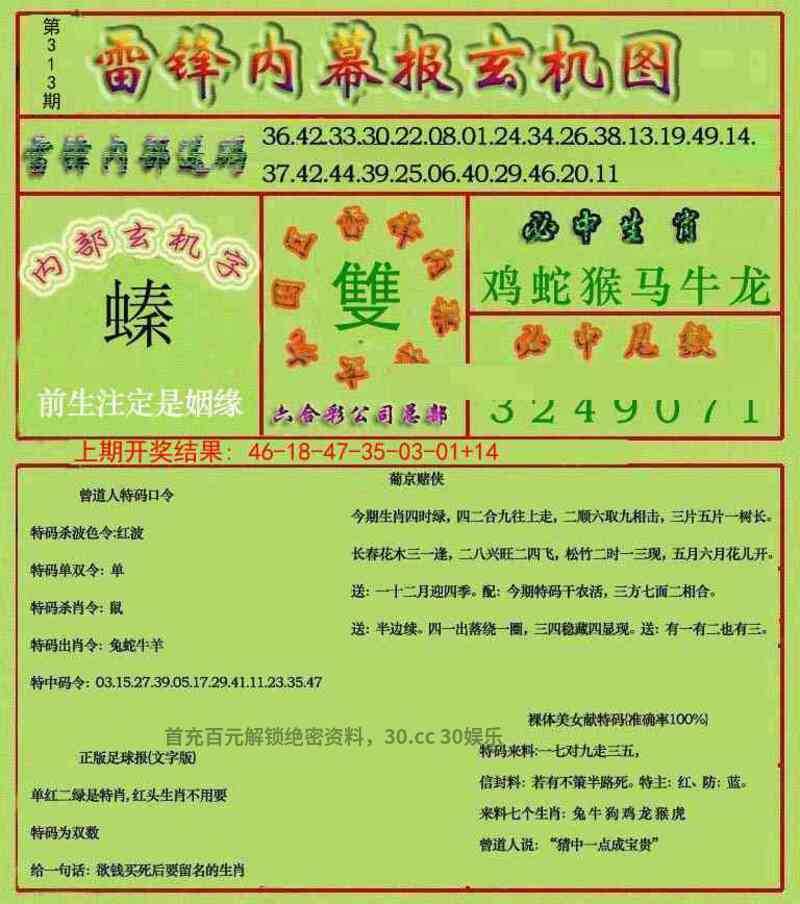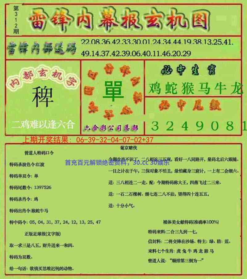 306期:男女两肖男肖+鸡蛇』开:牛17准